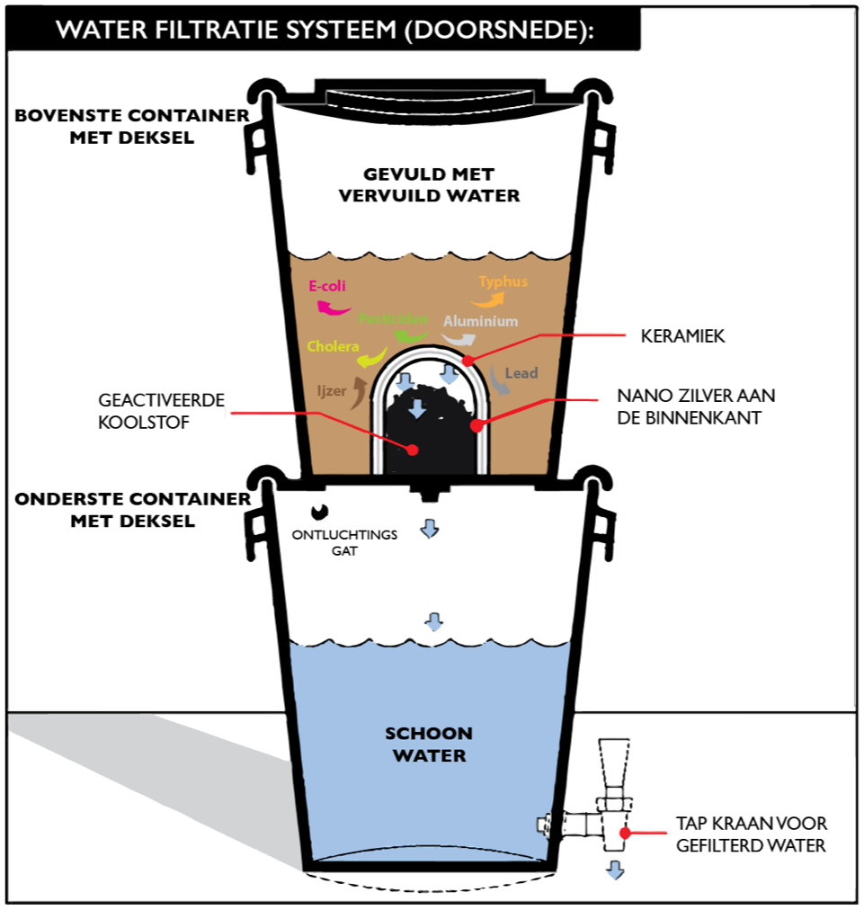 Het maakt gebruik van zwaartekrachtfiltratie, dus er is geen externe stroomvoorziening nodig. De bovenste emmer vult u met het ongezuiverde water, dat door het Tulip-filter stroomt en veilig drinkbaar bewaard wordt in de onderste emmer.